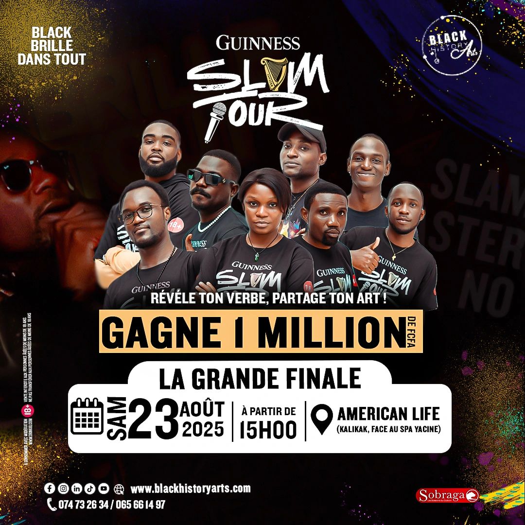Le Guinness Slam Tour touche à son apogée avec sa grande finale. Après des semaines de compétitions intenses et des mots qui ont fait vibrer tout le Grand Libreville, les 8 meilleurs slameurs sont en lice pour décrocher le titre ultime et une somme exceptionnelle de 1 000 000 de francs CFA !
